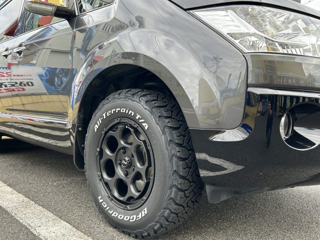 そして、マットブラックのホイールにホワイトレターのオールテレーンタイヤ