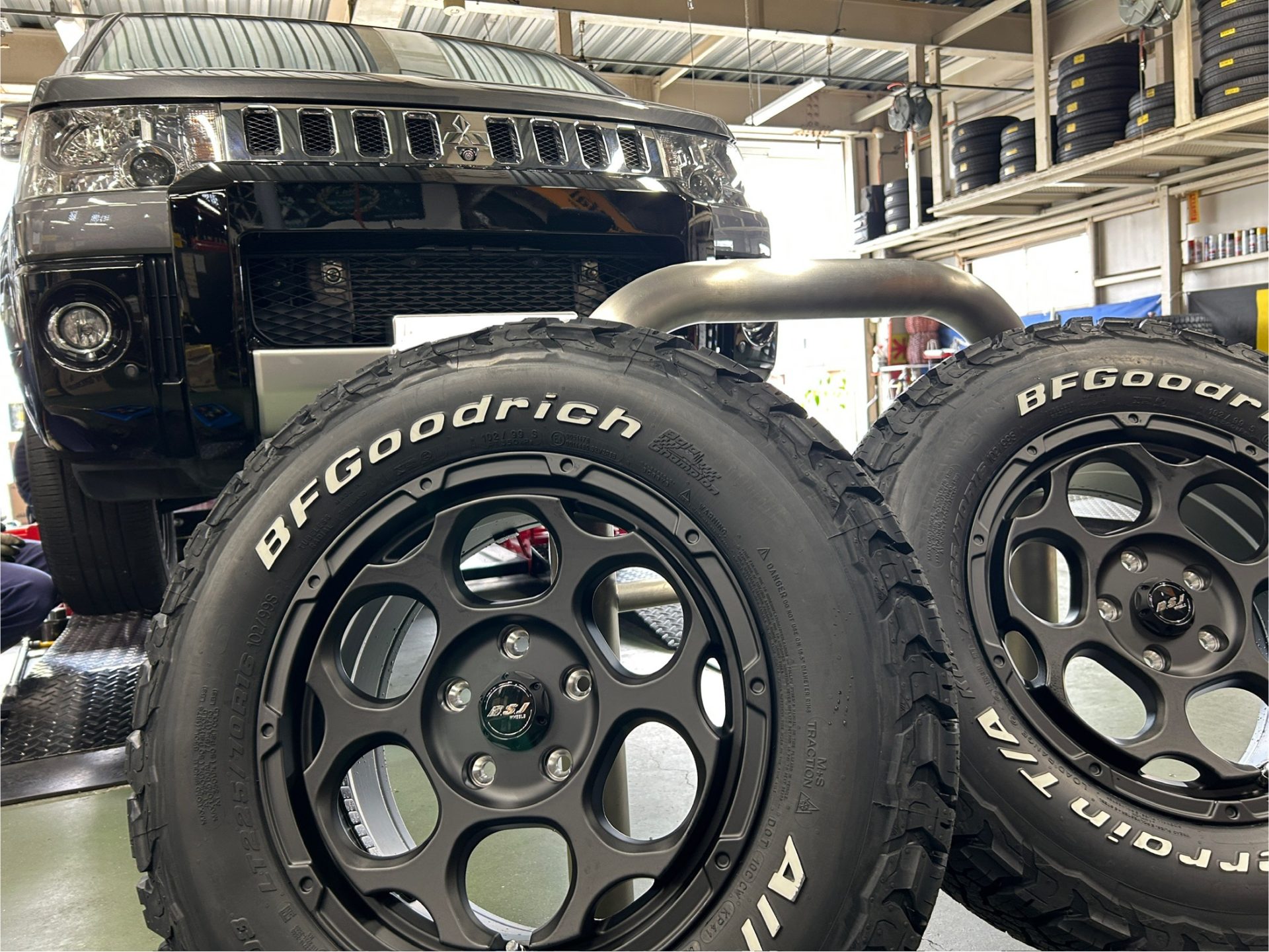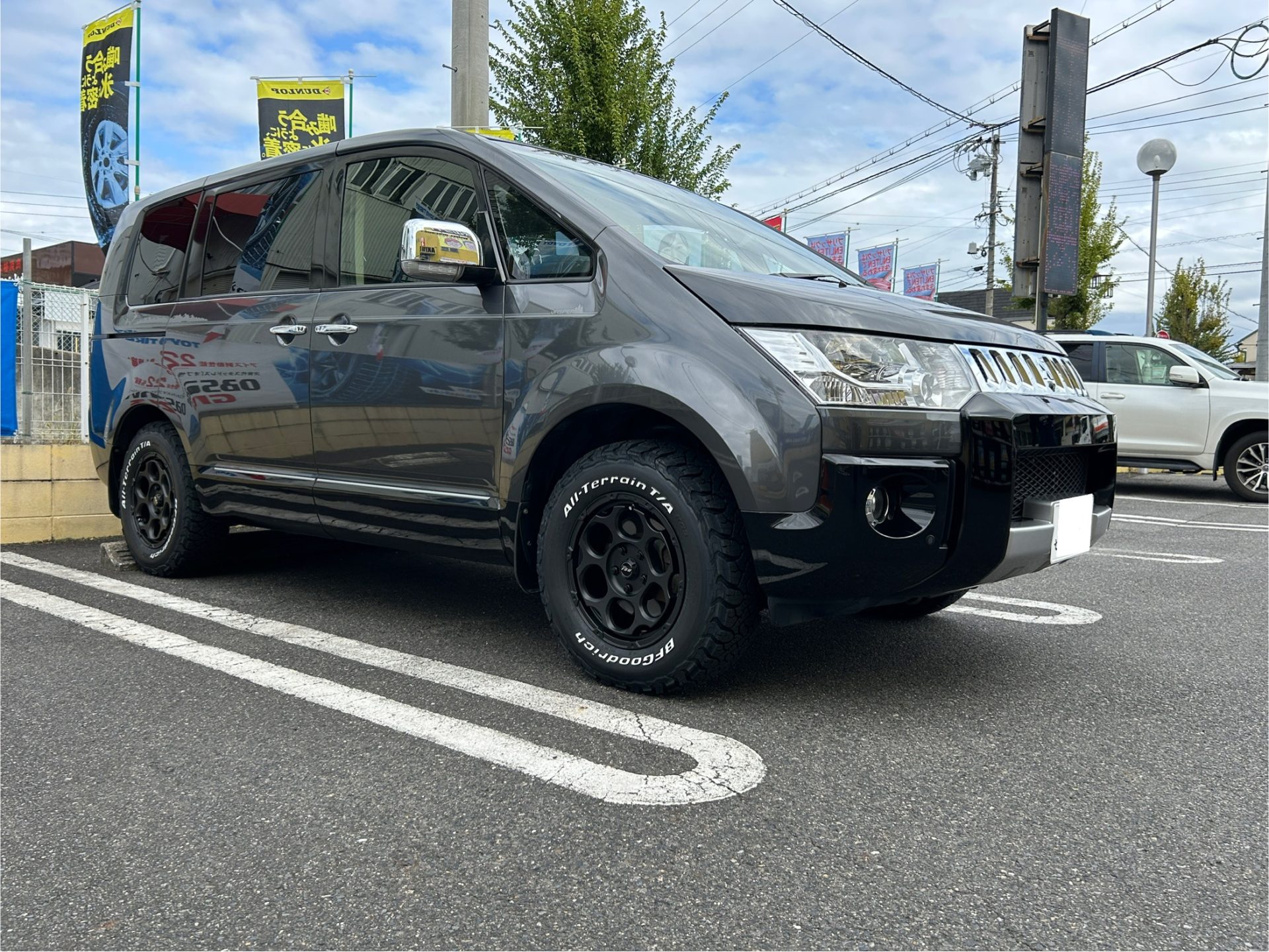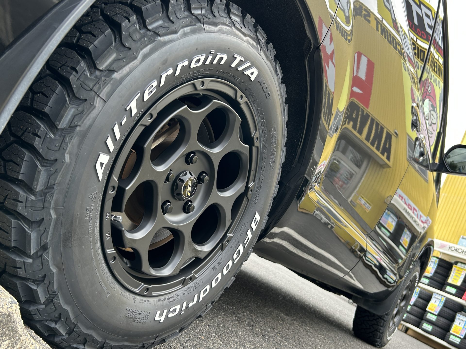 そして、マットブラックのホイールにホワイトレターのオールテレーンタイヤ
