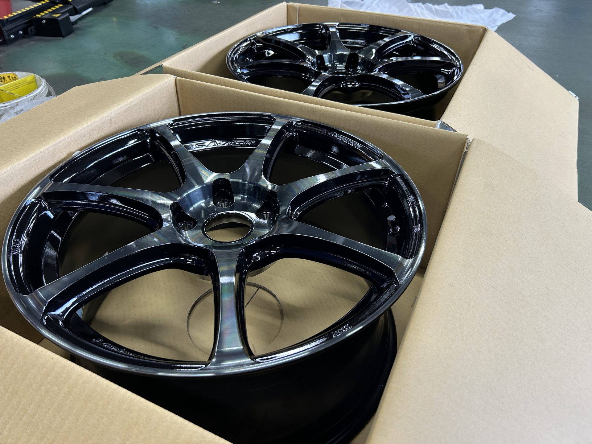 ブラックの塗装をベースに、スポークの天面切削後、少し青み掛かったカラークリアーを全塗装!