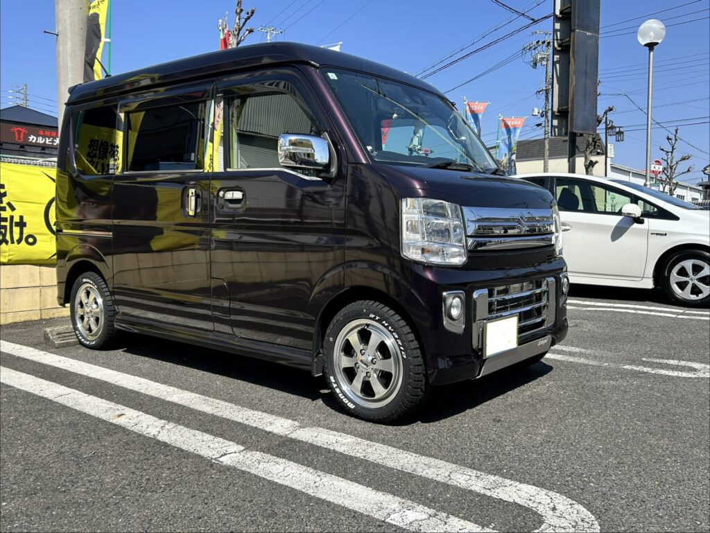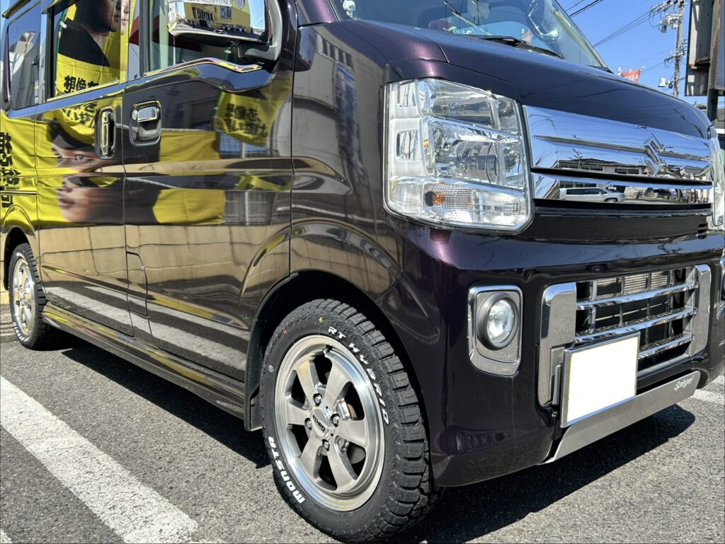 14インチでも存在感抜群のホワイトレターが、エブリィのサイドビューをグッと引き締めます👍